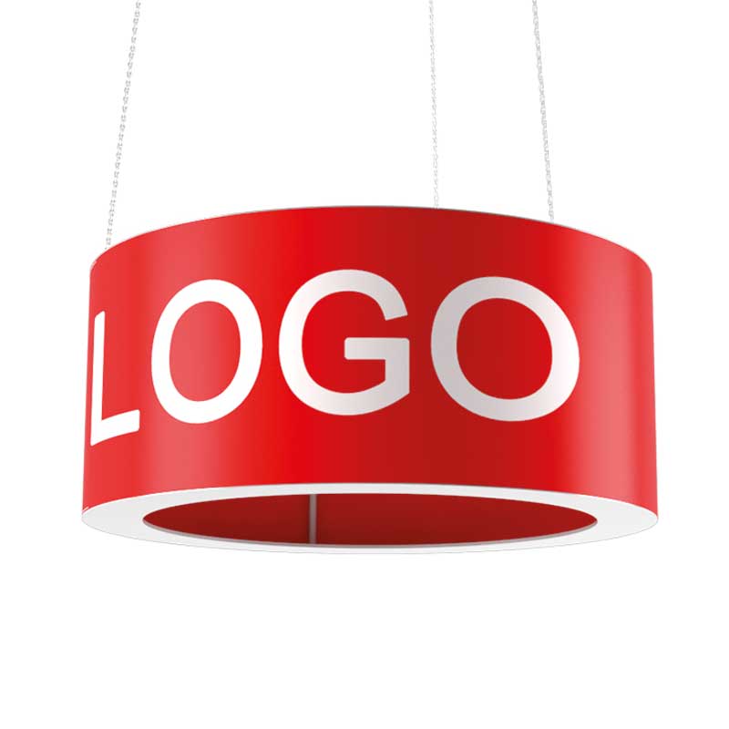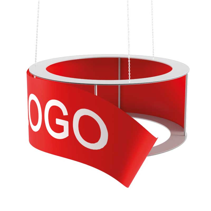 Ein imposanter, kreisrunder Deckenhänger für den Messeeinsatz oder Innenraumgestaltung. Durch seine Größe und hochwertige Verarbeitung eignet er sich ideal für auffällige Markenpräsentationen, Promotions oder Eventdekorationen. Der leichte, aber stabile Alurahmen sorgt für einfache Montage und sicheren Halt.