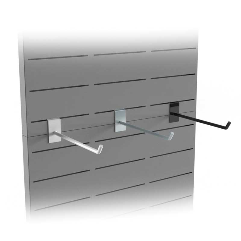 Dieser spezielle 25 cm lange Haken ist für Schlitzwandsysteme konzipiert und ermöglicht eine stabile und ordentliche Anordnung von Blisterverpackungen, Einzelartikeln und Zubehörteilen. Ideal für Technik-, Werkzeug-, Haushalts- oder Drogerieprodukte.