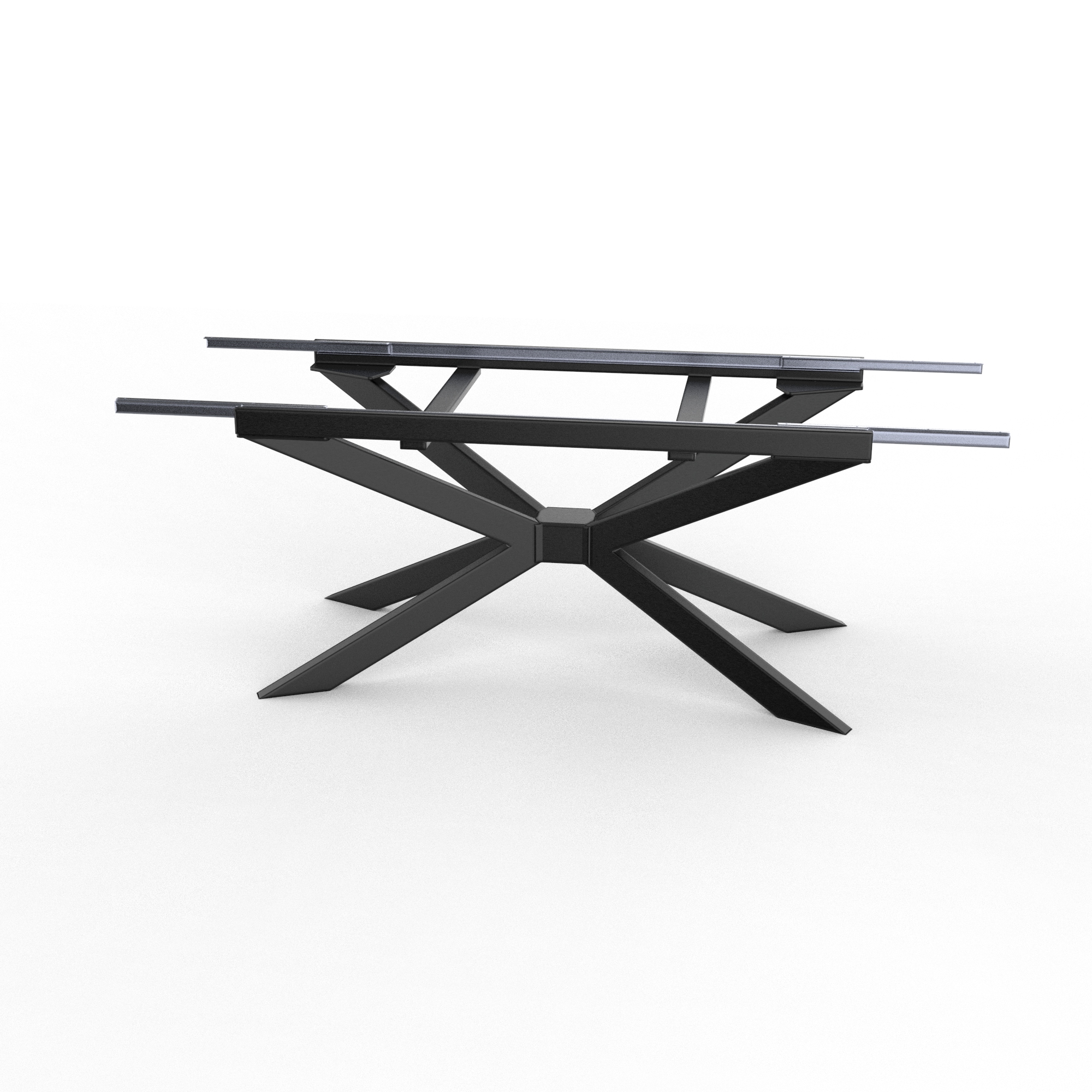Der zentrale Adapter Der Knotenpunkt des gesamten Gestells ist ein massiver, zentral positionierter Adapter. In diesem Bauteil laufen alle wirkenden Kräfte der massiven Tischplatte zusammen. Er sorgt für eine perfekte Gewichtsverteilung und maximale Stabilität der gesamten Konstruktion. Eine dezente Abdeckung verbirgt die Verbindungselemente und sorgt für eine saubere, minimalistische Optik unter dem Tisch.